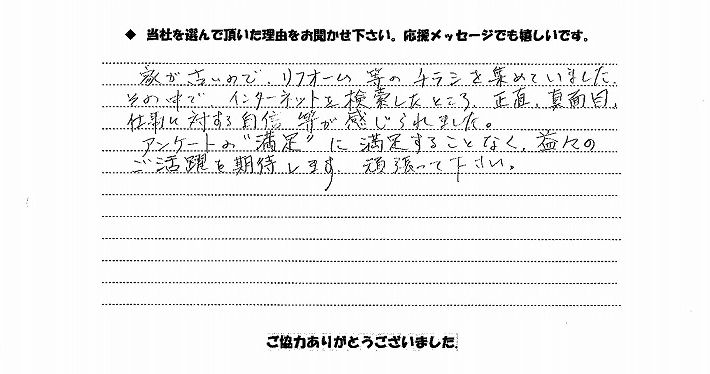 完璧なご対応の会社だと思いました。今回、雨漏りしているのではないか?という不安があり、ご相談したところ、すぐに無料診断にきて頂きました。結果として雨漏りしていないかもしれないということで様子をみることにしました。お暑い中且つ遠方から来て頂き、結果としてすぐに工事には繋がりませんでしたが、嫌な顔ひとつもせずに、ご対応頂けました。大変信用出来る会社だと思いました。 詳細を隠す