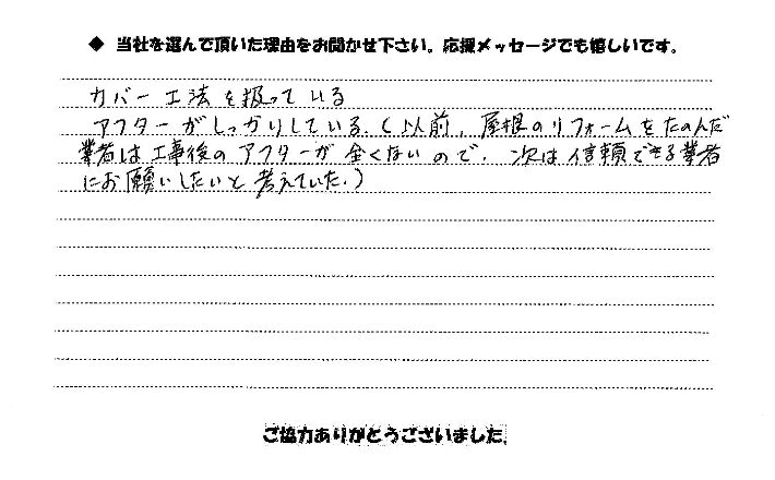 完璧なご対応の会社だと思いました。今回、雨漏りしているのではないか?という不安があり、ご相談したところ、すぐに無料診断にきて頂きました。結果として雨漏りしていないかもしれないということで様子をみることにしました。お暑い中且つ遠方から来て頂き、結果としてすぐに工事には繋がりませんでしたが、嫌な顔ひとつもせずに、ご対応頂けました。大変信用出来る会社だと思いました。 詳細を隠す