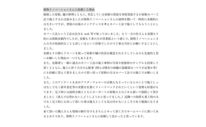 この度は実家の雨漏りを直していただき、ありがとうございました。 一度見ていただいてから数年たっての同じ場所の雨漏り。 正直本当に直してもらえるのかと思いました。 ですが、今回はじっくりとあらゆる方向からチェックしていただき、原因をつきとめ、修繕方法の細かいところまで話してくださり納得のいく対応でした。 無事に工事も終わりましたが、また違う部屋から雨漏りが。 今後何度も来ていただくことになりそうですが、情熱リノベーションさんを利用させていただきます! 詳細を隠す