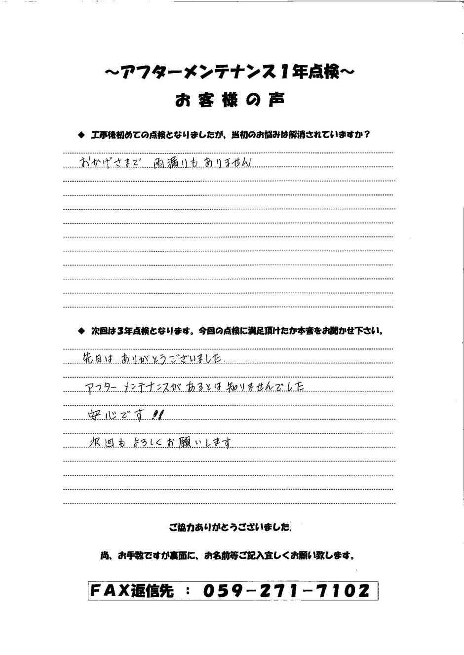 • 「ケイミュー」津市一志町T様 外壁張替え工事・1年アフター点検