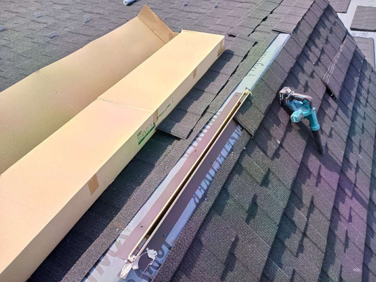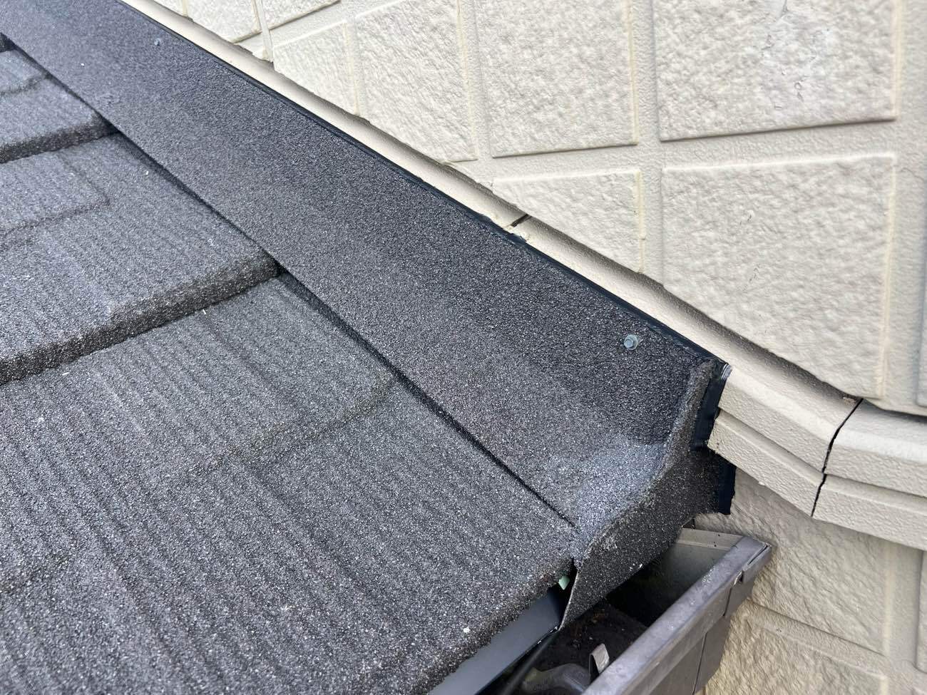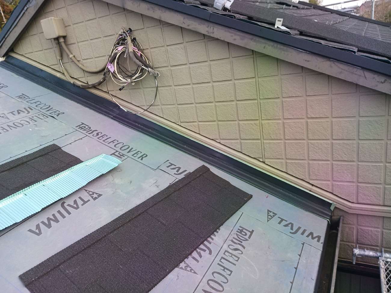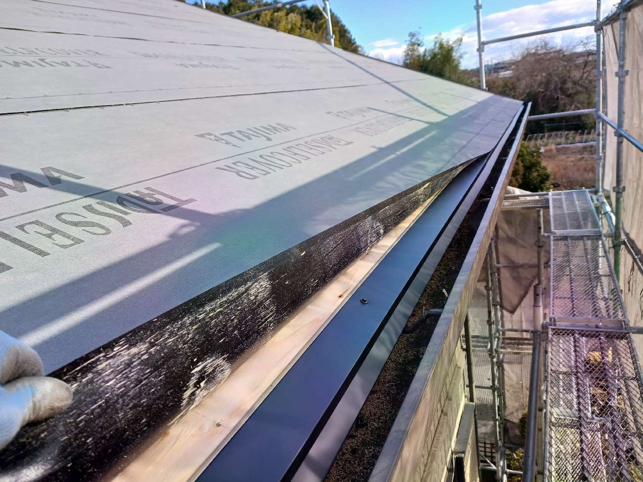 ⑯壁際水切り(外壁を伝ってきた雨水が屋根内部に侵入するのを防ぎ、効率的に排水します。)を施工します。