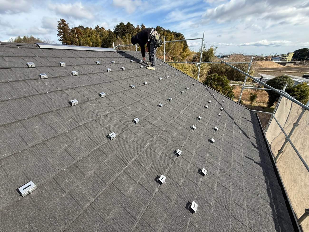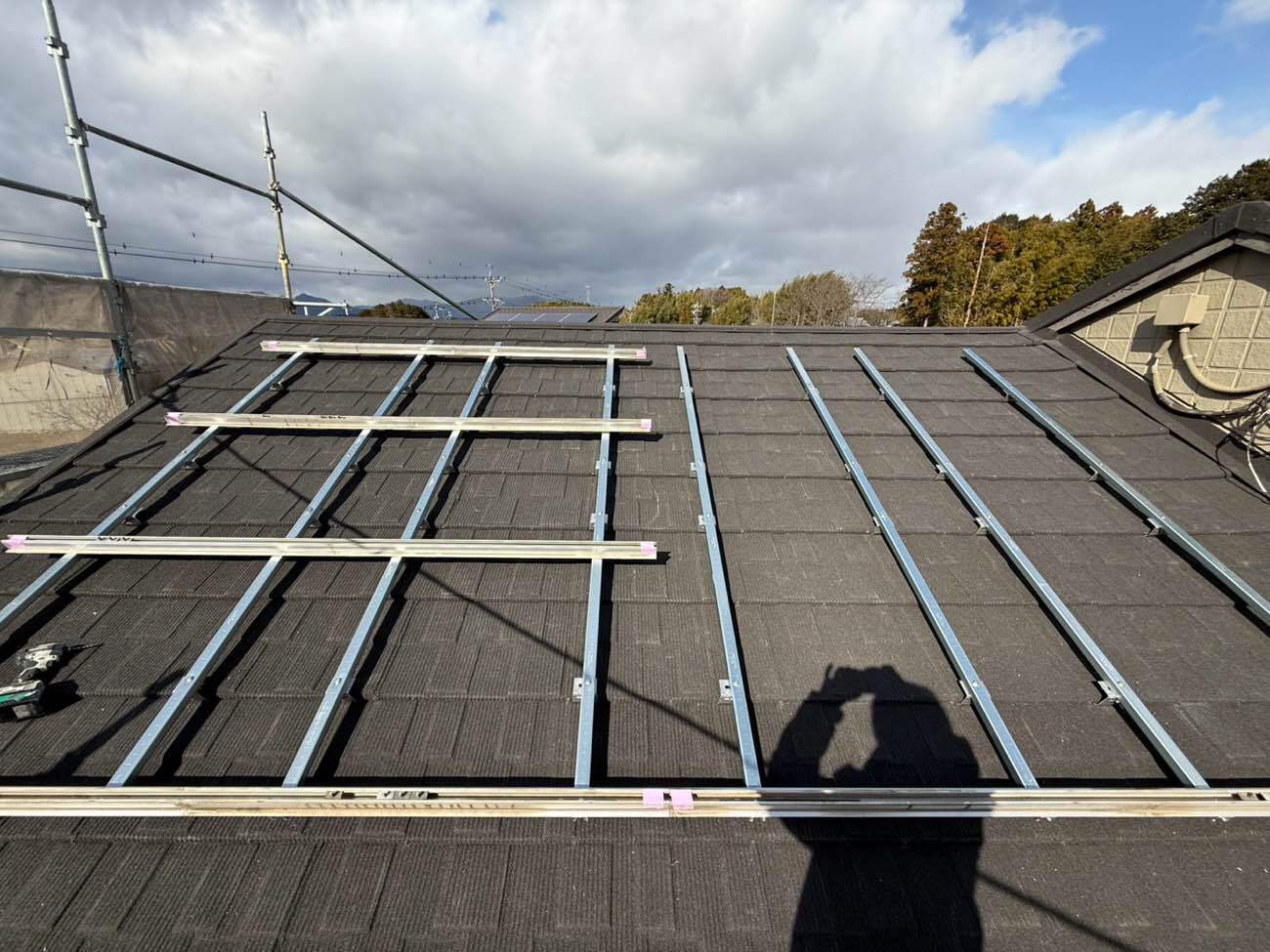 ⑭屋根を葺きながら太陽光金具を取り付けていきます。