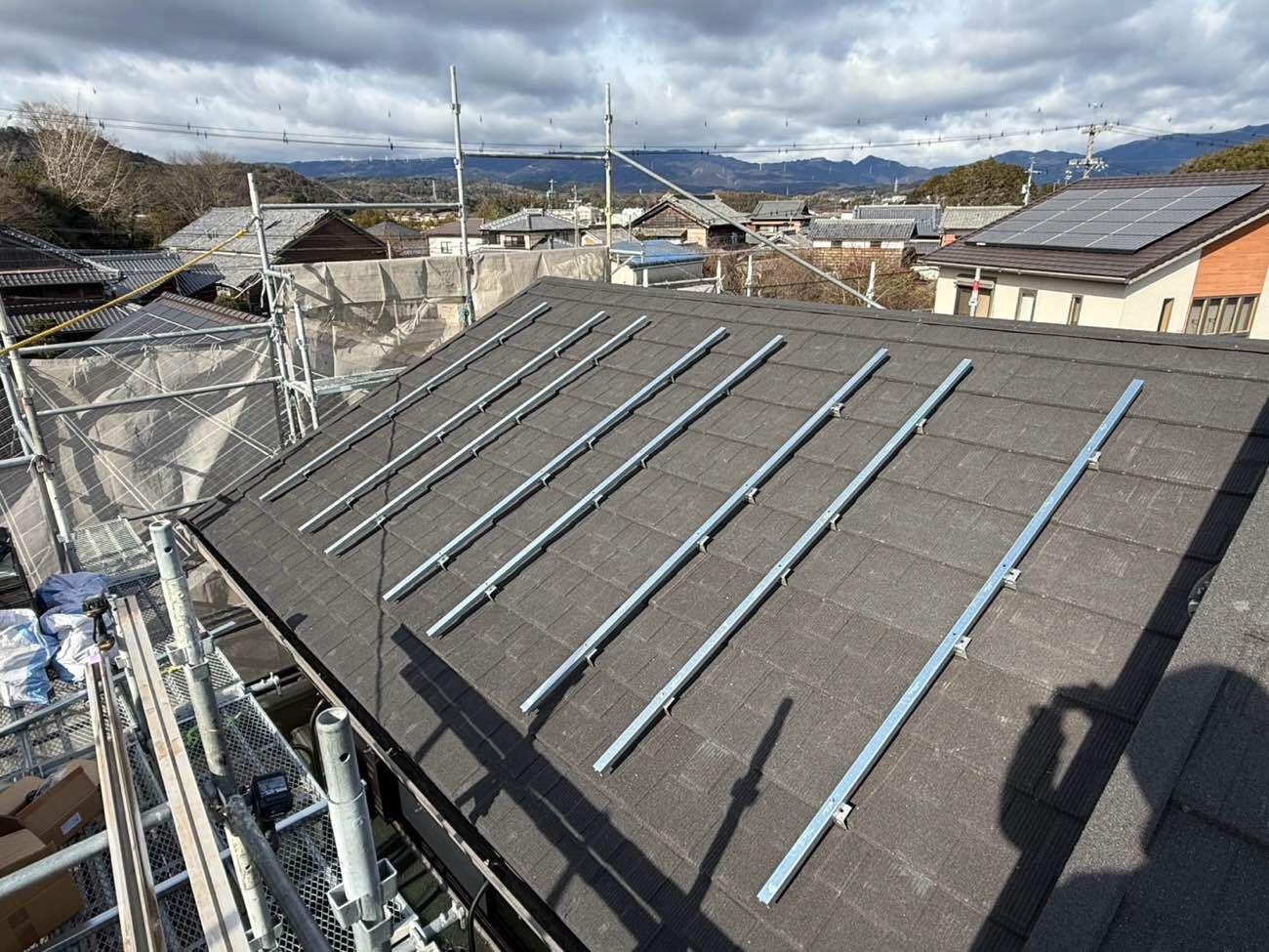 ⑮屋根葺きと太陽光金具取り付けの過程です。