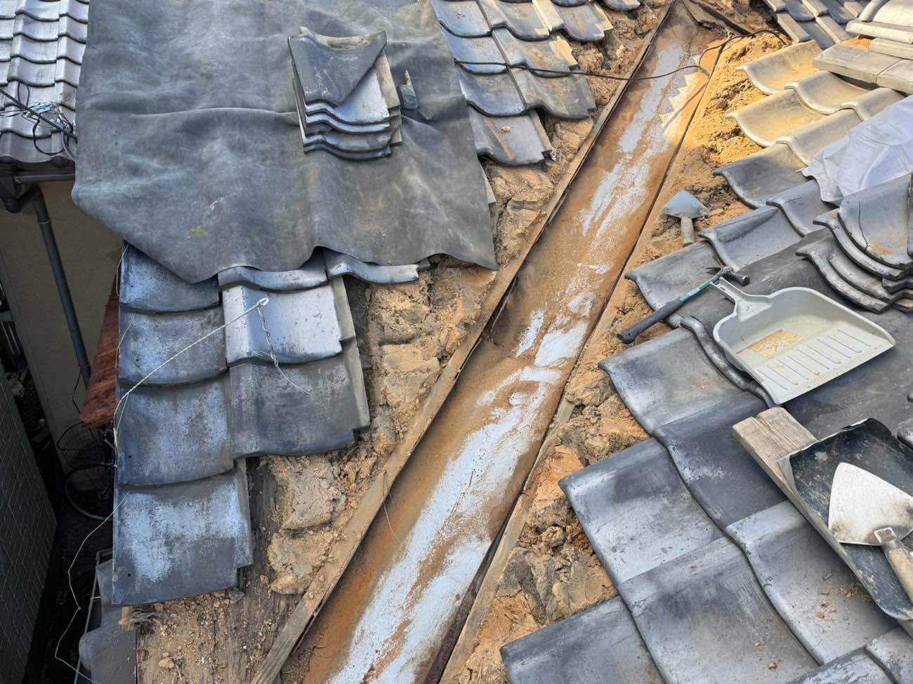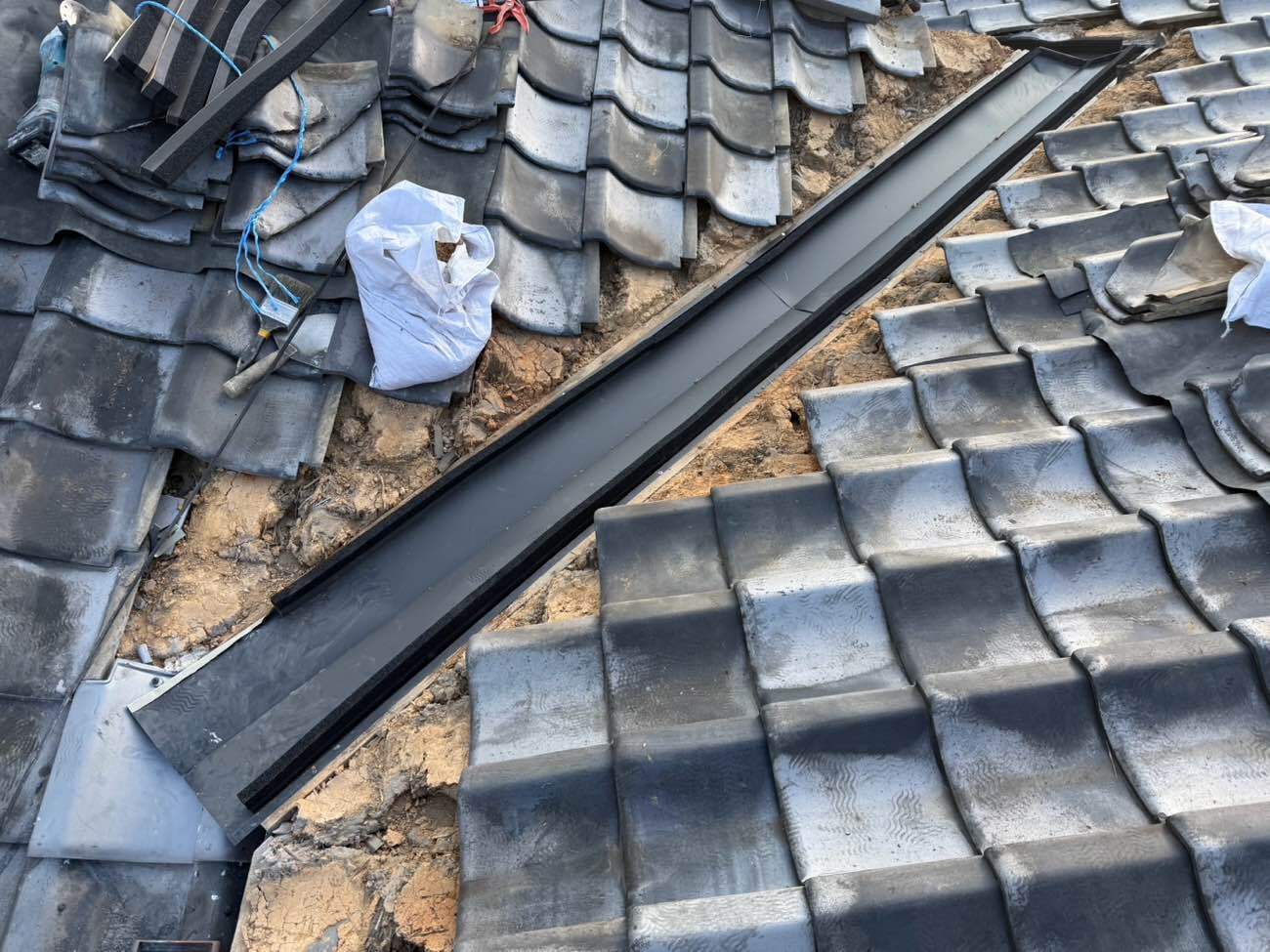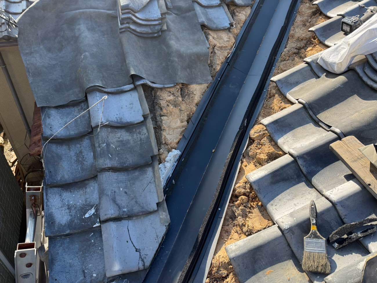 ⑤谷板金の隙間にモルタルを施工し、瓦を葺いていきます。