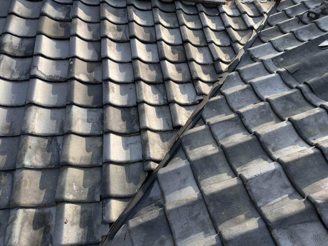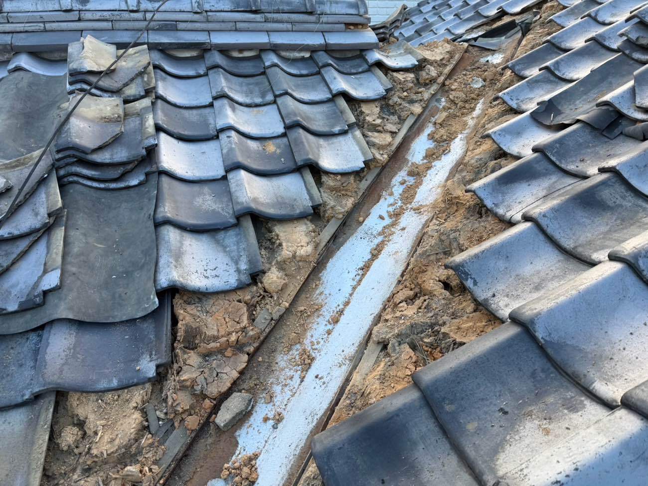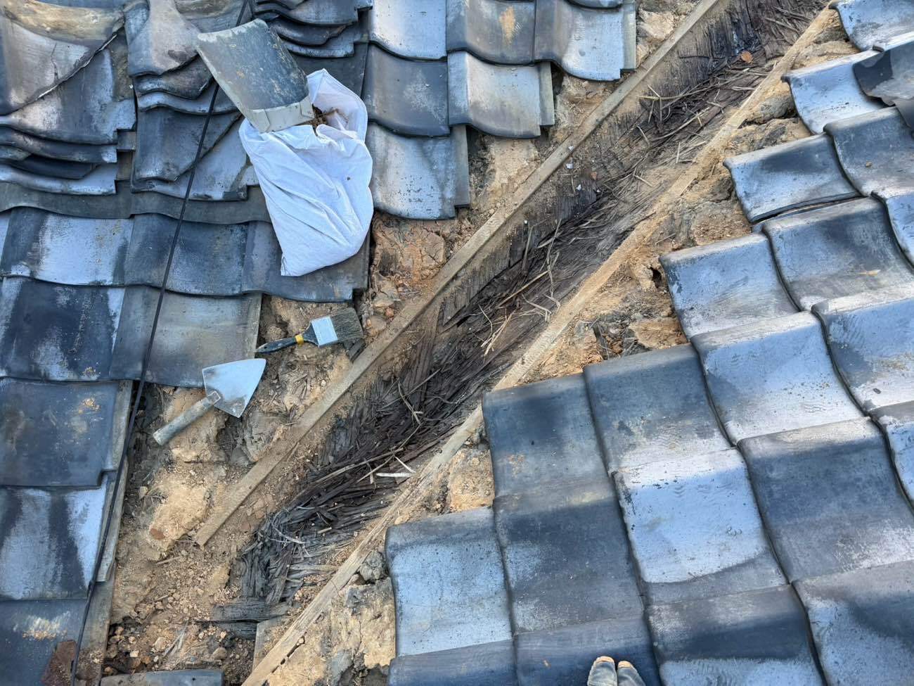 ⑤谷板金の隙間にモルタルを施工し、瓦を葺いていきます。