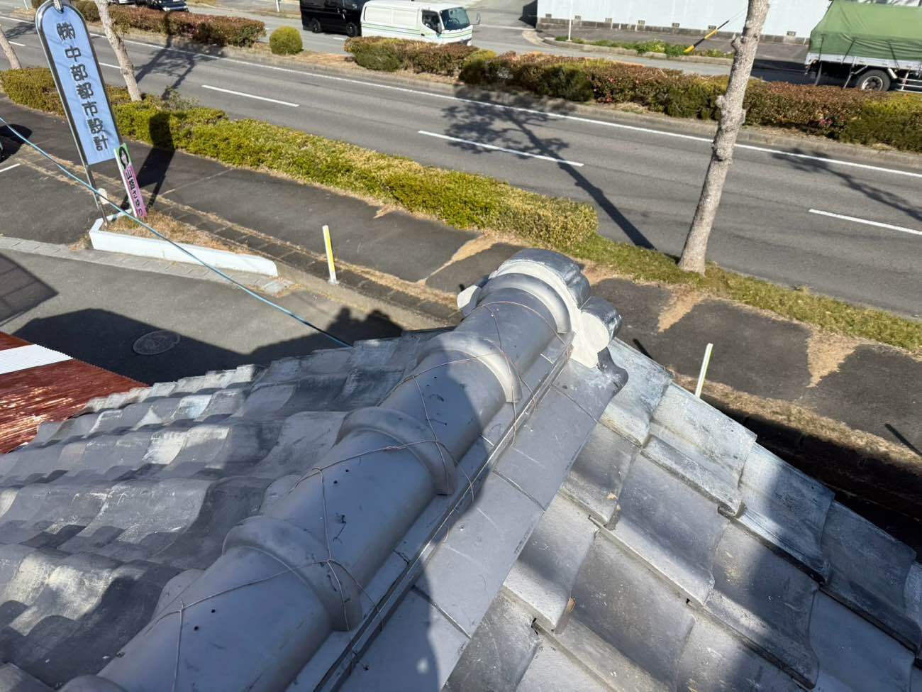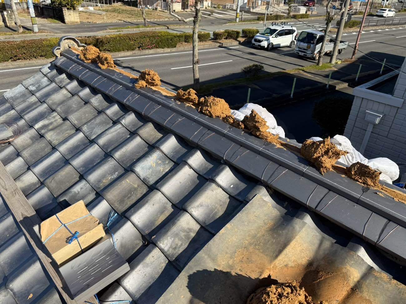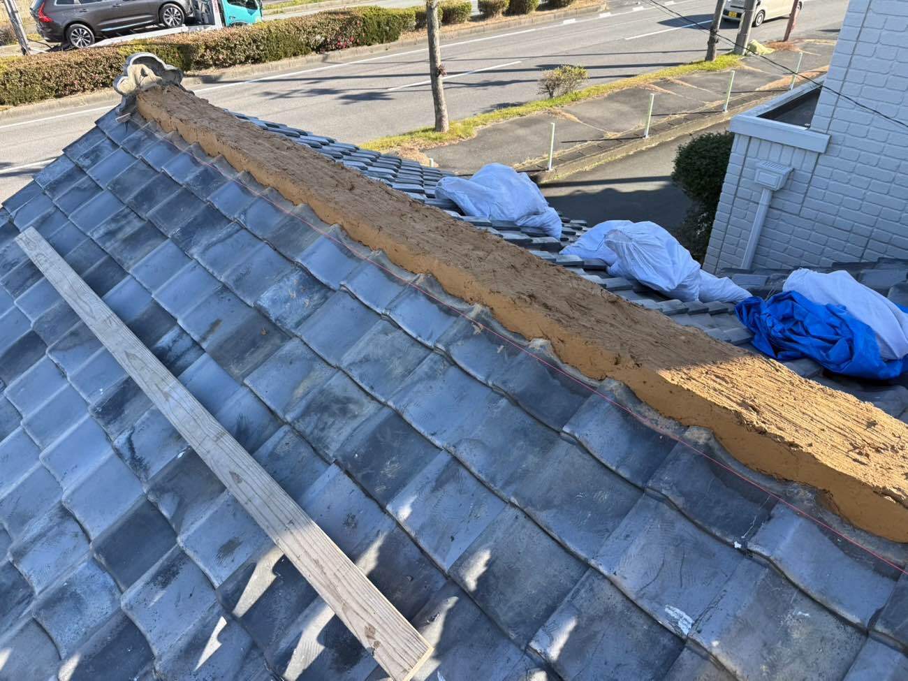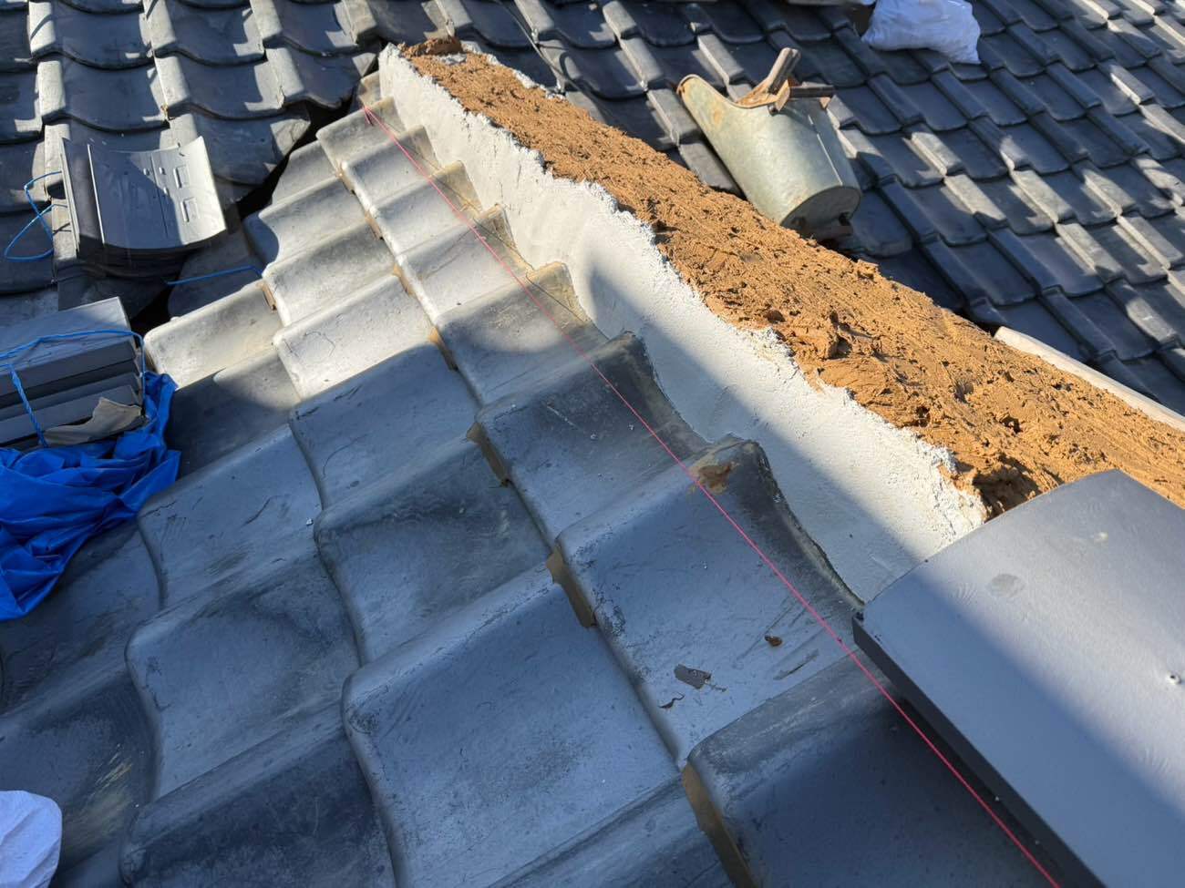 ⑯棟部分に、土台となる屋根土とモルタルを施工し、熨斗瓦を葺いていきます。
