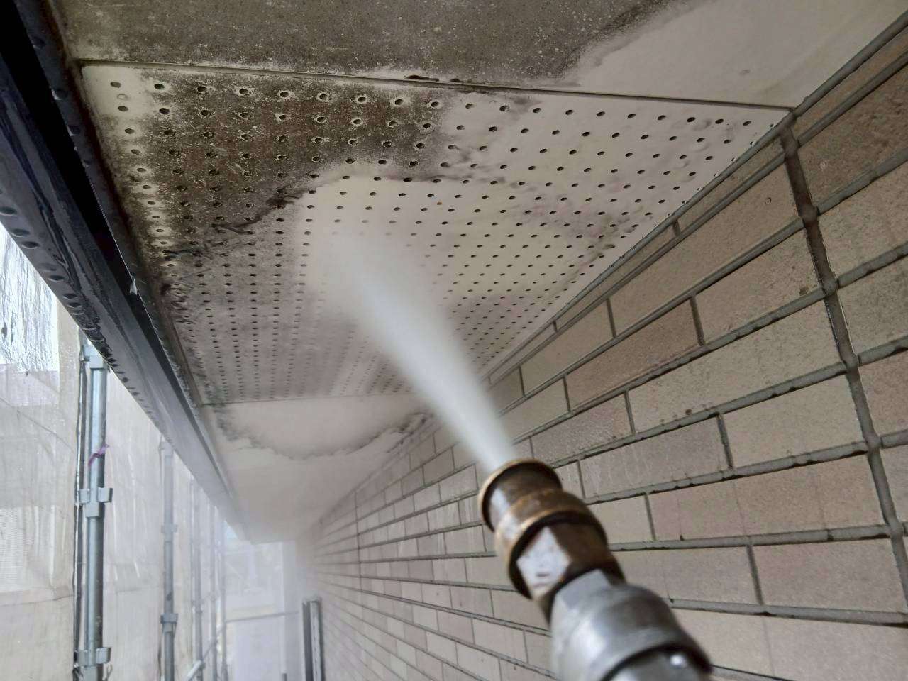 ⑬軒天も綺麗に洗浄していきます。