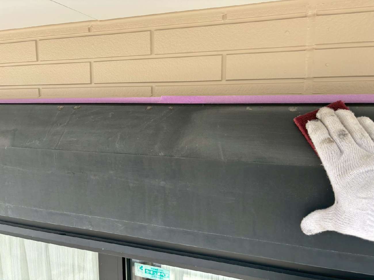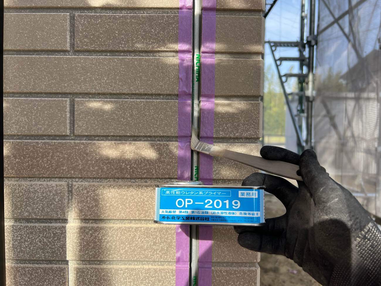 ④プライマー(下地材)を塗布していきます。(コーキングの密着性を高める為)