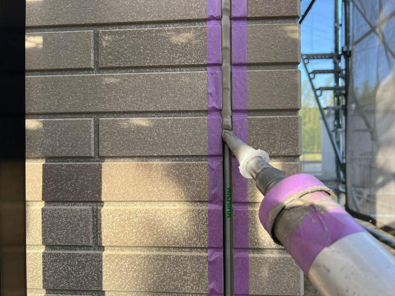 ②コーキングを充填する箇所にマスキングテープを貼っていきます。(コーキングがはみ出さないようにする為)