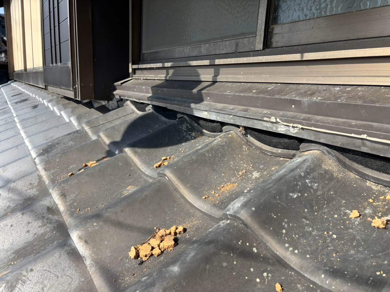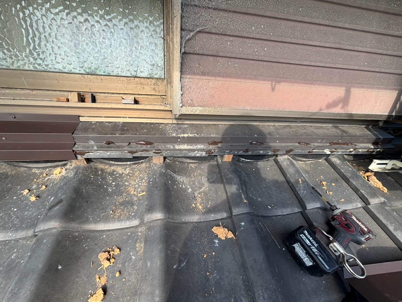 ①脱落した熨斗瓦を戻し、瓦の隙間にシーラーテープ(隙間を埋めて、外部からの雨水等の侵入を防ぎます。)を施工しました。