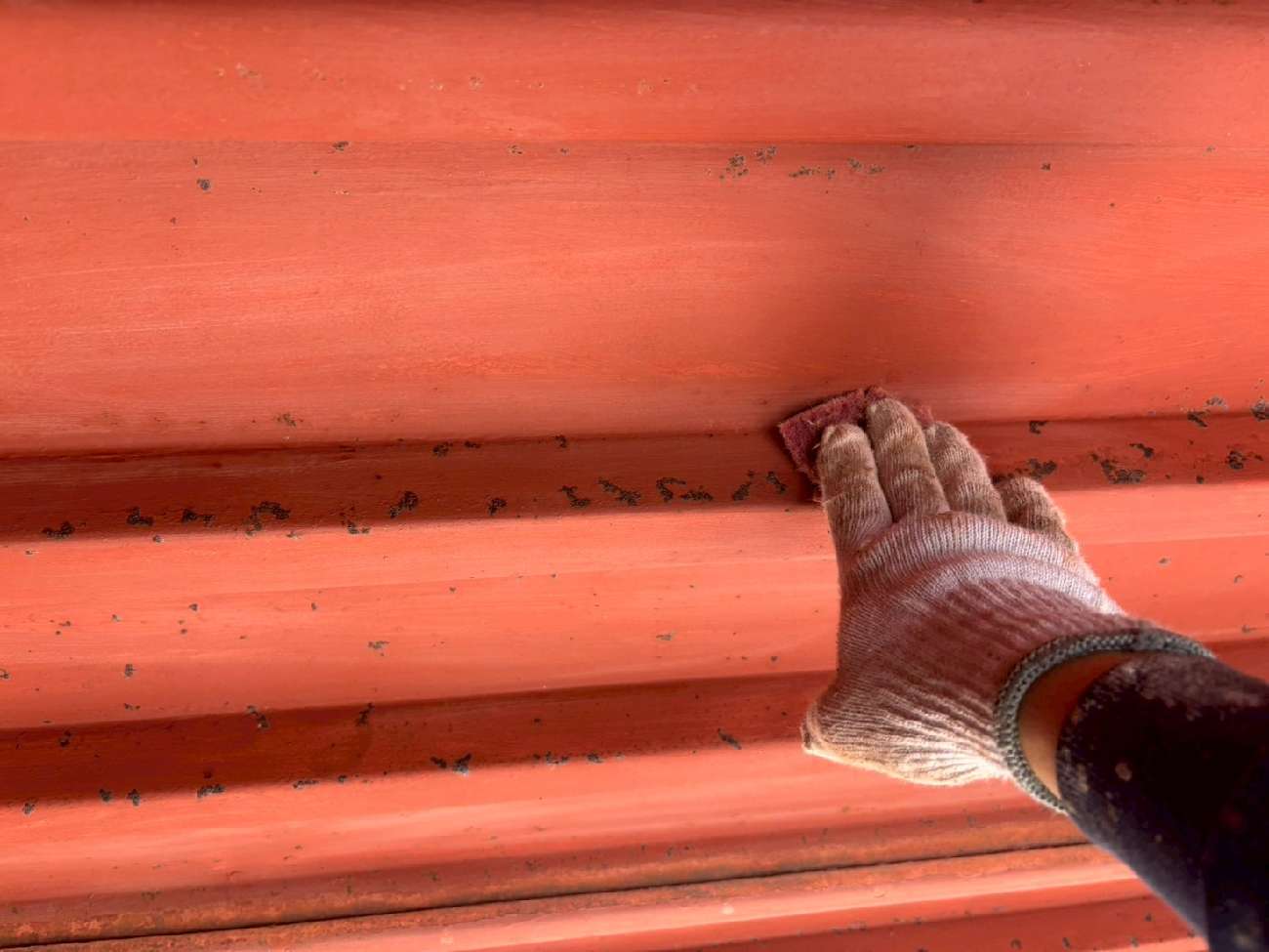 ①下地についたサビや古い塗膜をヤスリで除去していきます。