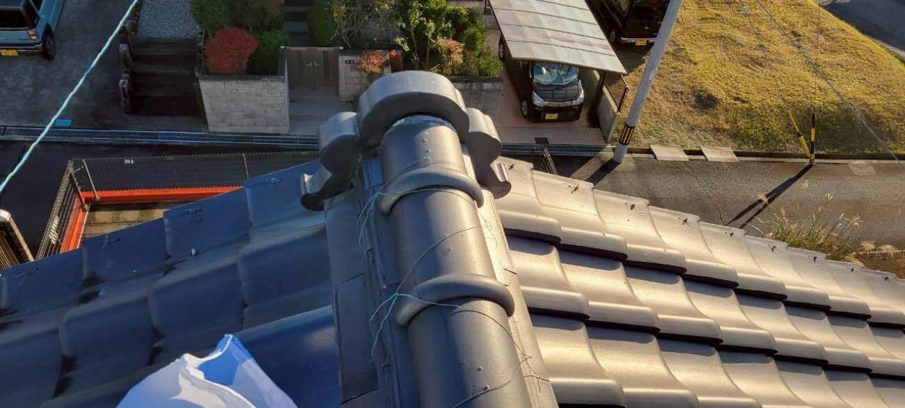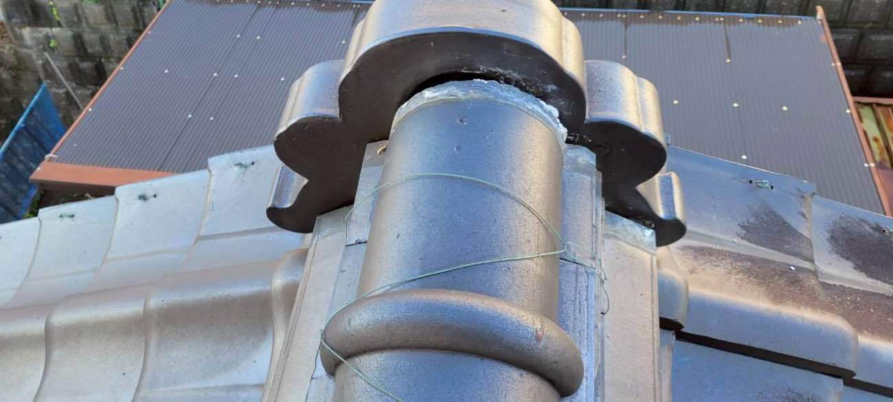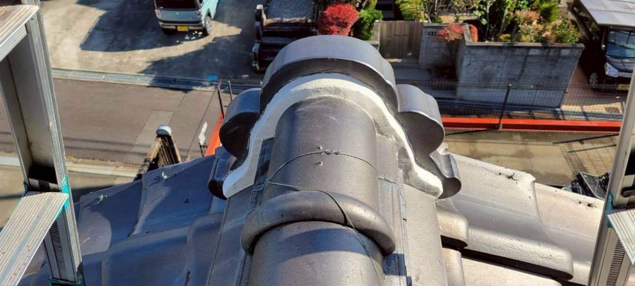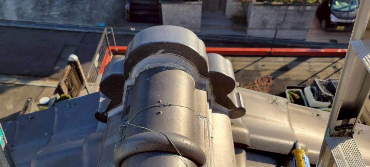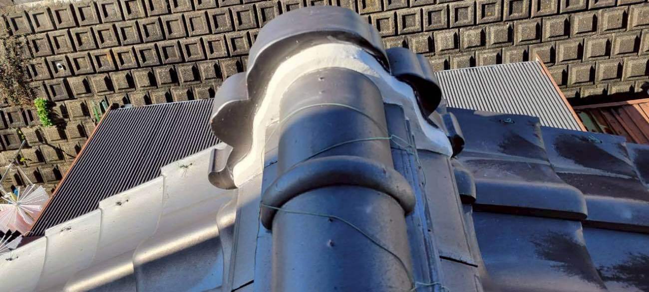 ㉗鬼瓦漆喰を固定するためコーキングを充填し、下地補強を行っていきます。