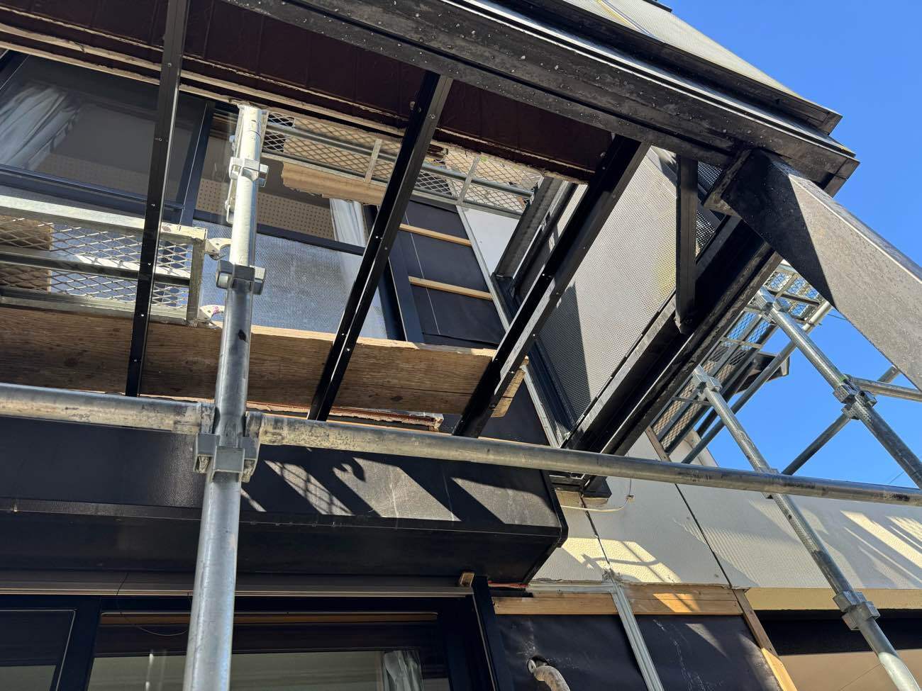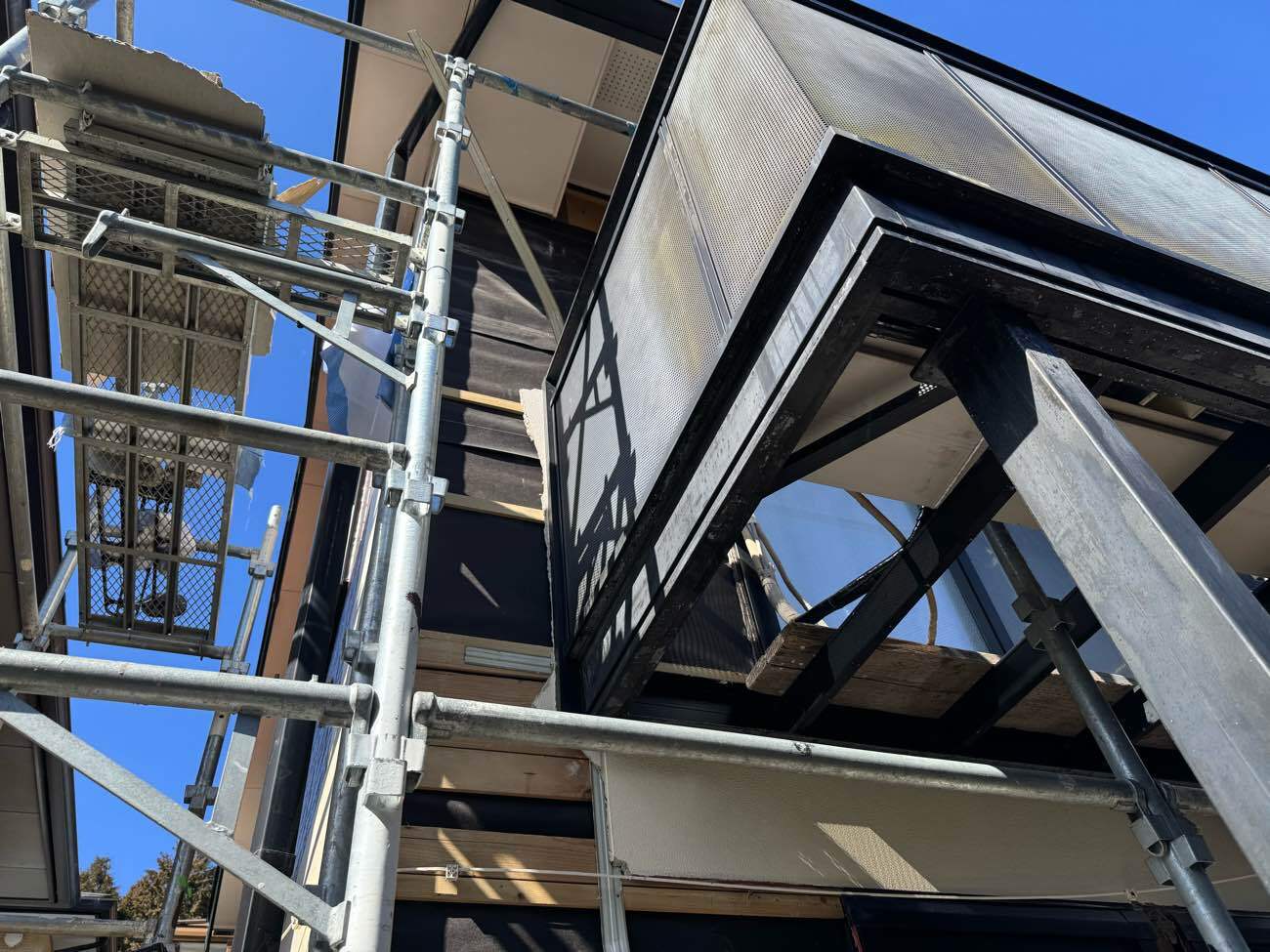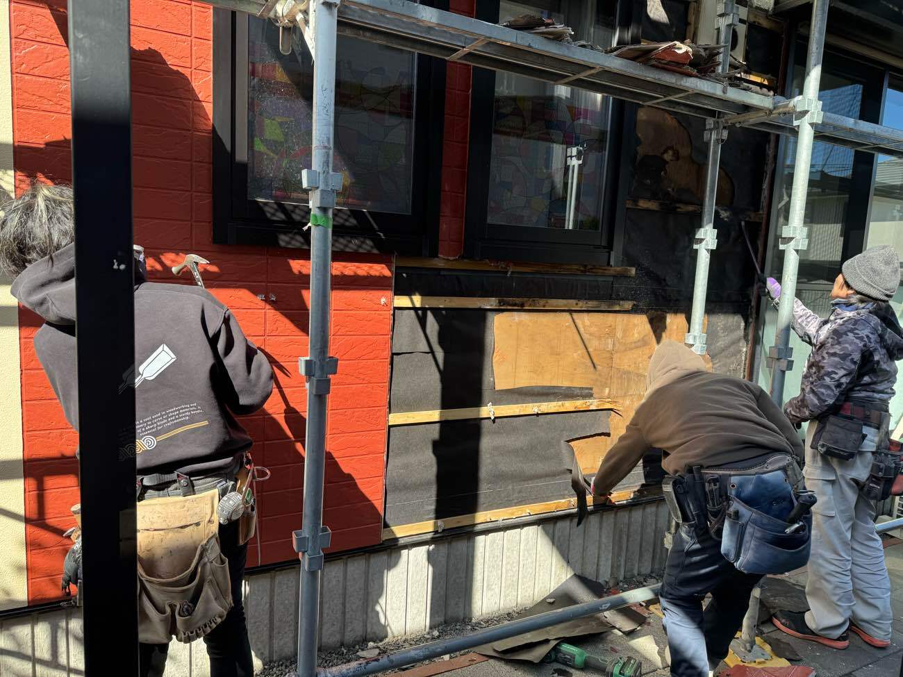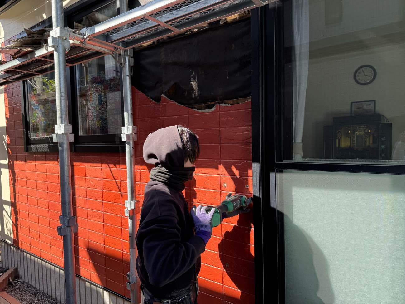 ③足場を組み立て、外壁を解体していきます。