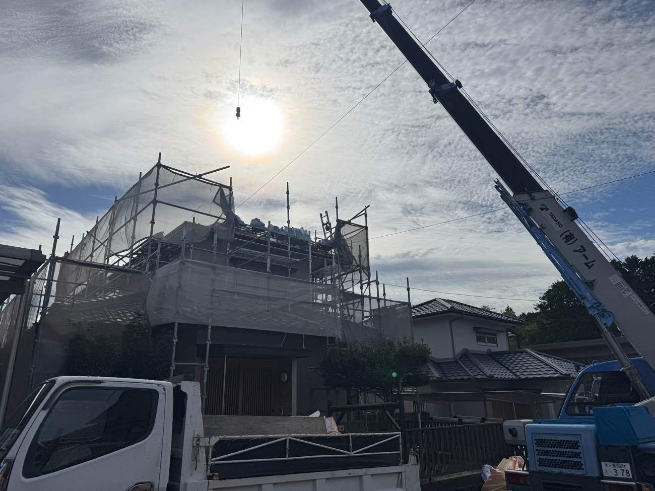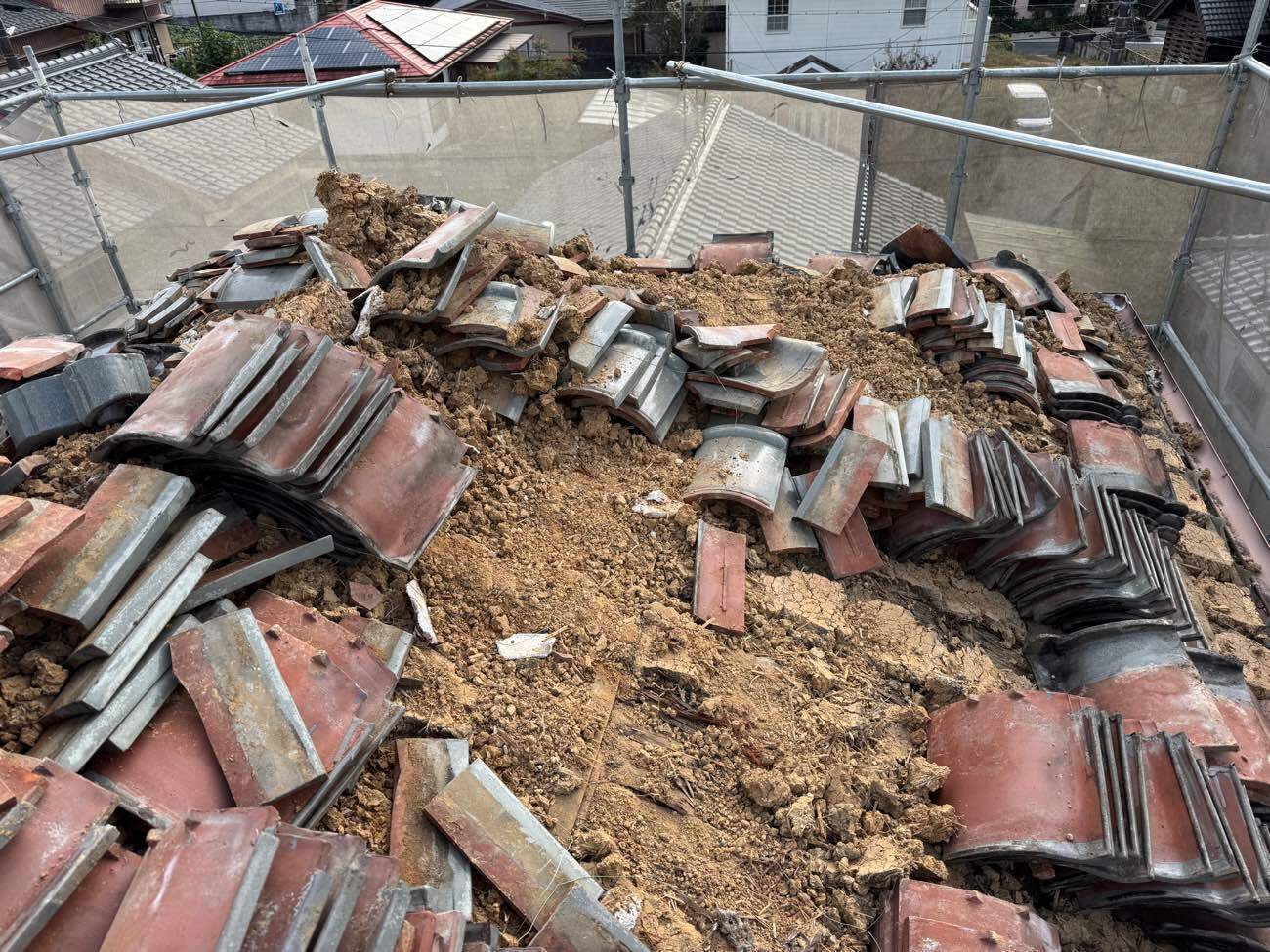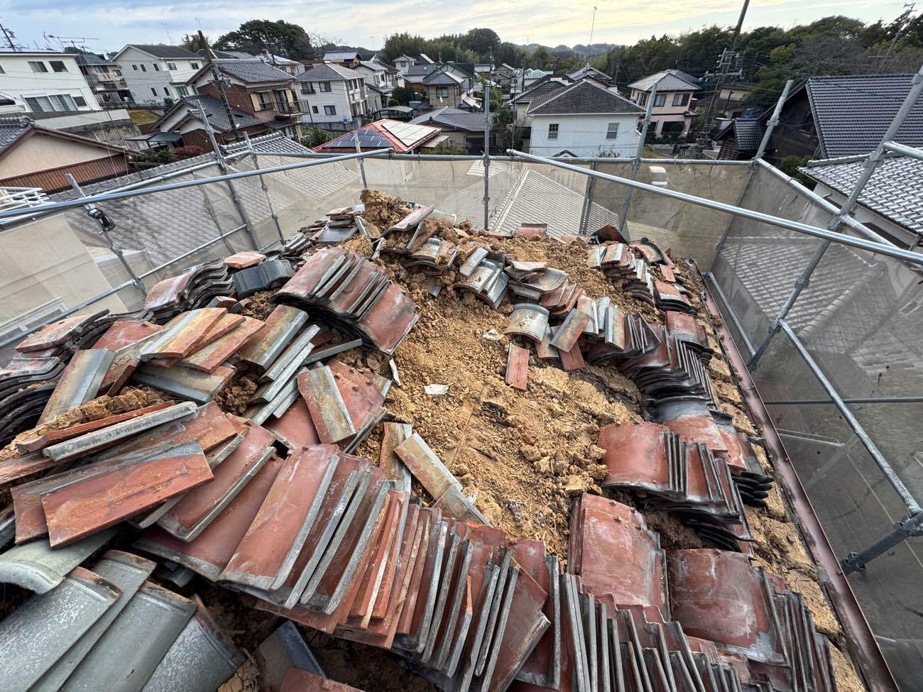 ③解体された瓦をクレーンで運び撤去しました。