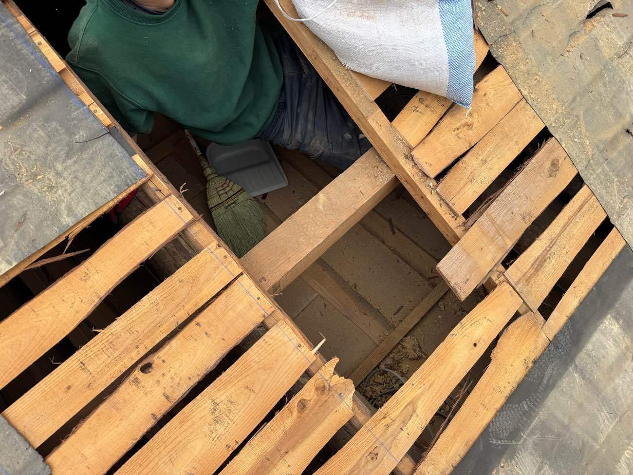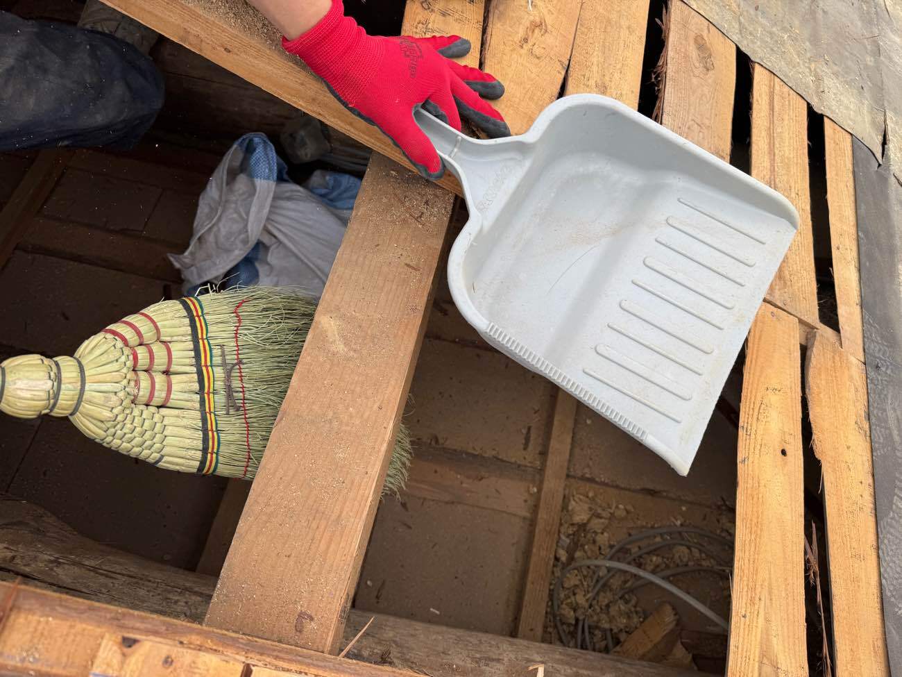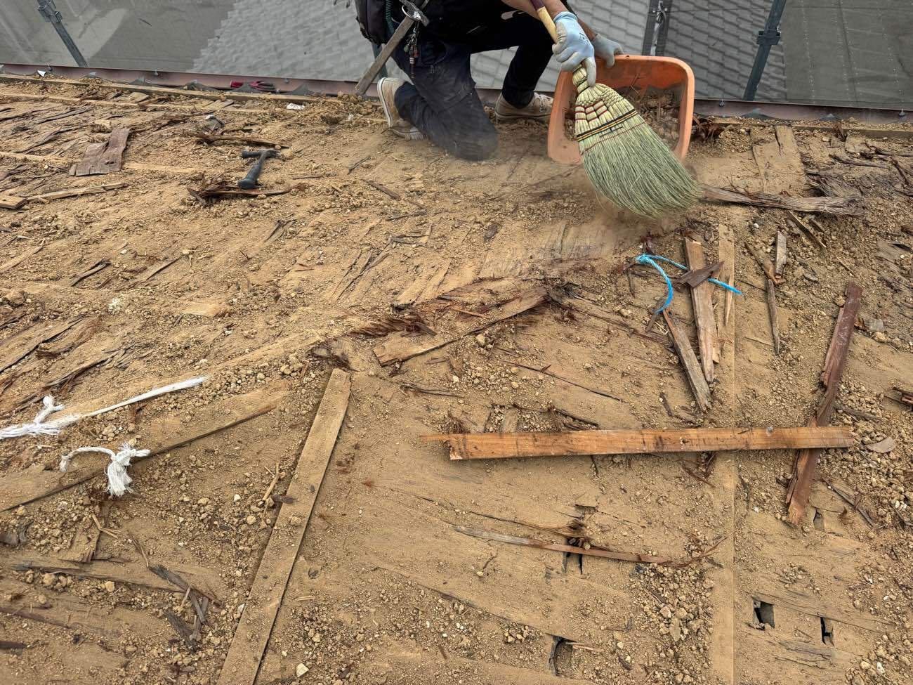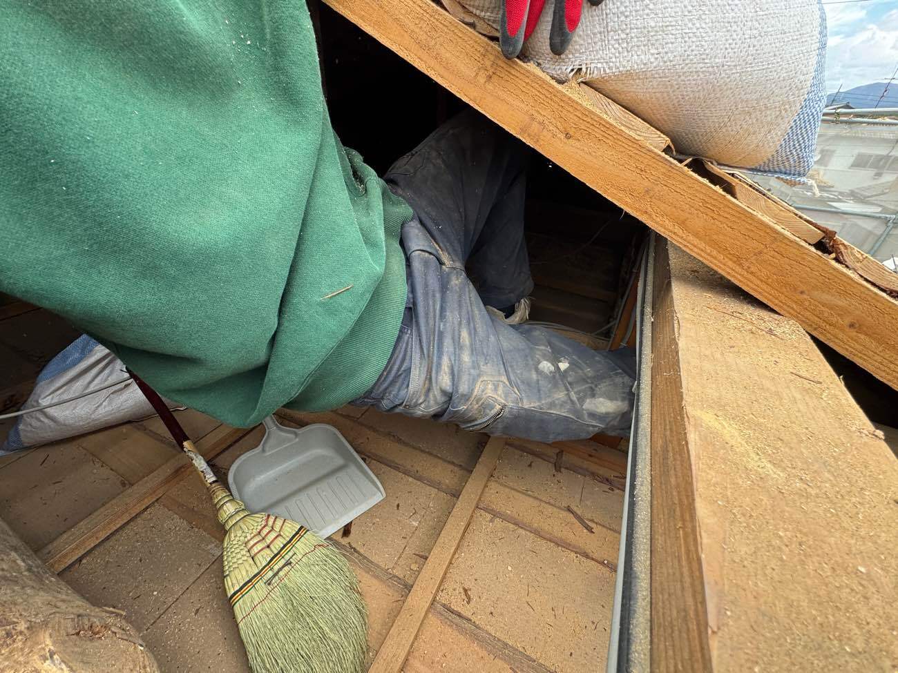 ⑨屋根裏の土を掃除していきます。