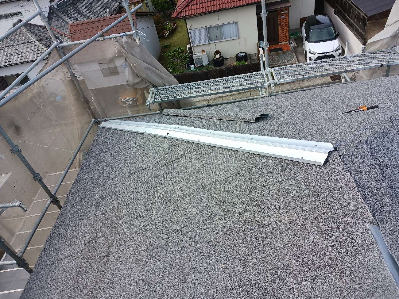 (捨て水切り板金とは、屋根の先端部分・防水シートの下へ施工することにより、軒先から下地内へ雨水が入らない役割があります。)