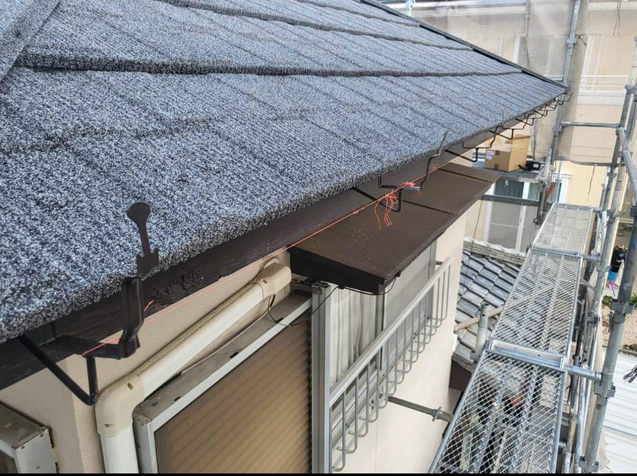 ⑮軒先(屋根の先端部)に捨て水切りを施工していきます。