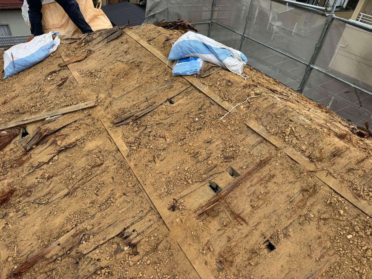 ⑤屋根土、杉皮を丁寧に撤去していきます。