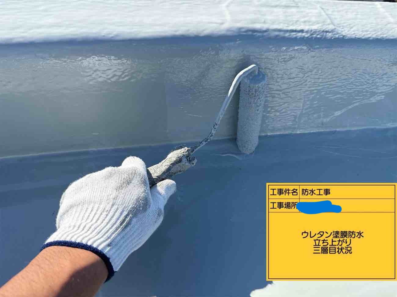 ⑭立ち上がりに、ウレタン塗膜防水三層目を塗布していきます。
