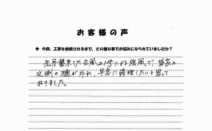 家の屋根がズレているのを発見し、「このままだと雨漏りして大変なことになる…!」と焦っていました。どの業者に相談すればいいか悩んでいたとき、ふとラジオ番組で耳にした情熱リノベーションさんのことを思い出しました。「見積もり無料」と言っていたのを思い出し、とりあえず電話してみることに。 結果、大正解でした!対応も丁寧で安心感があり、現地調査もスムーズ。屋根の状態や必要な工事についても分かりやすく説明してくれたので、信頼してお願いすることができました。 詳細を隠す