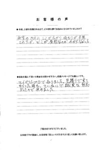 この度は実家の雨漏りを直していただき、ありがとうございました。 一度見ていただいてから数年たっての同じ場所の雨漏り。 正直本当に直してもらえるのかと思いました。 ですが、今回はじっくりとあらゆる方向からチ... 続きを読む