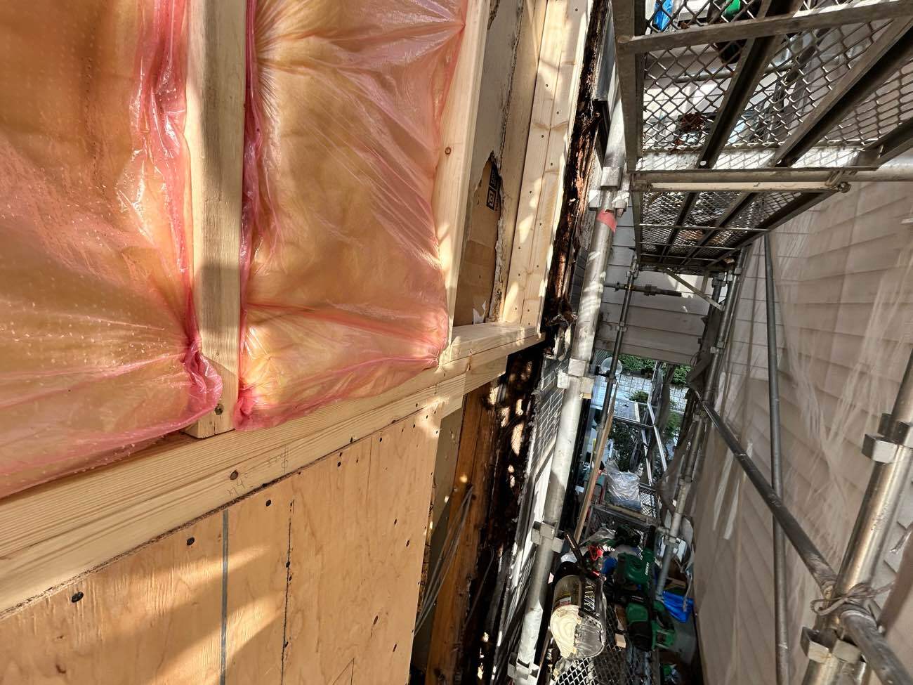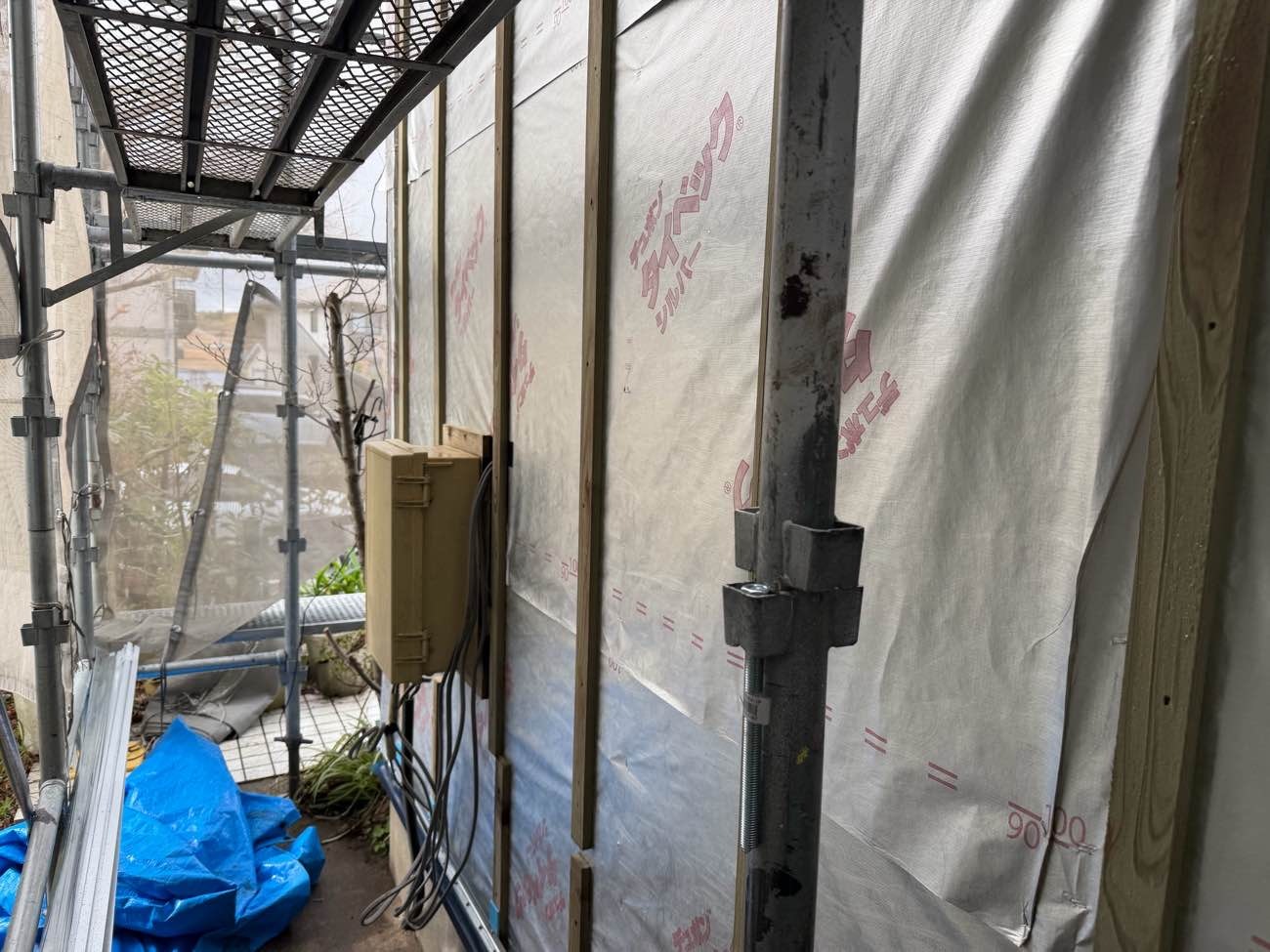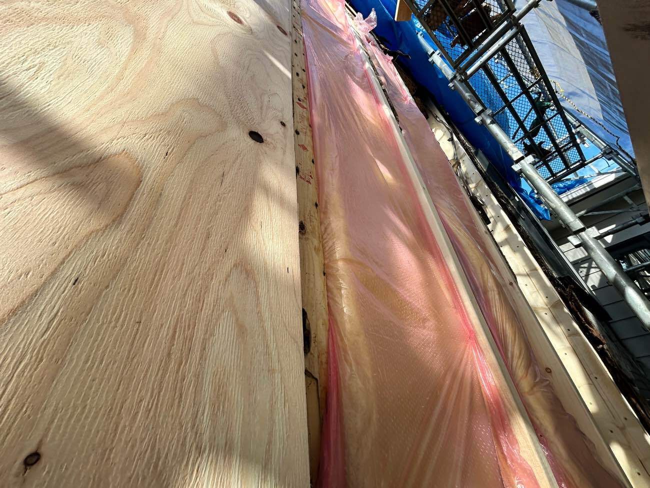 ⑮下地合板施工後、防水シートを貼って胴縁(サイディングを固定し、壁の強度を高めるほか、通気性を設けて湿気による結露を防ぎ、建物の耐久性を維持する)を施工します。