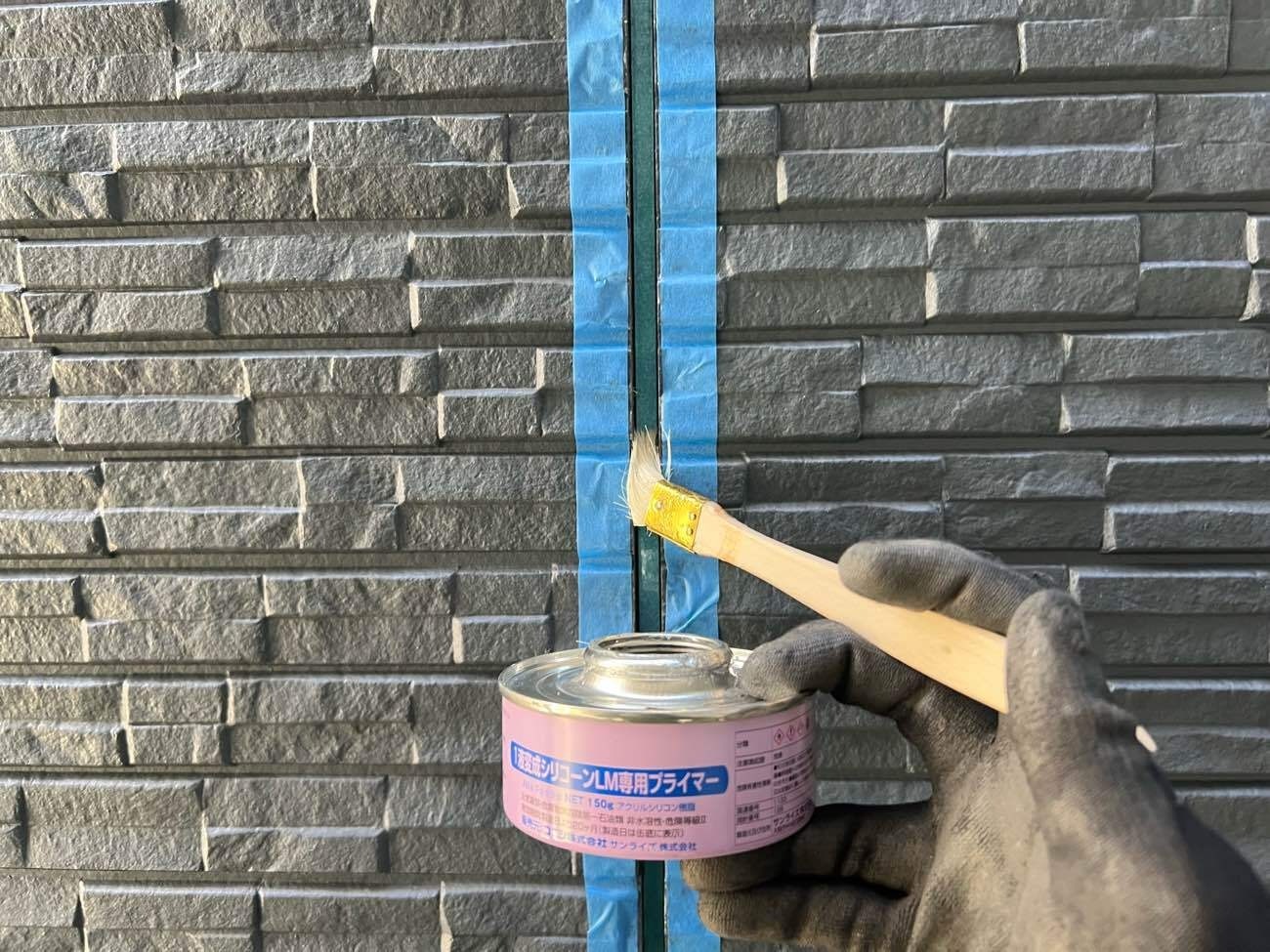 ㉓コーキングを充填する為に、マスキングテープを貼りプライマー(コーキングとの密着性を高め、剝がれを防ぐ)を塗布していきます。