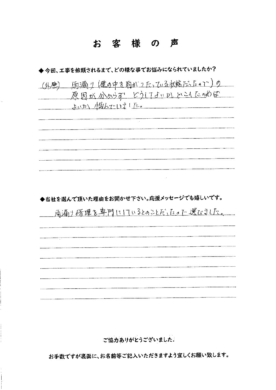 (外壁)雨漏り(壁の中を雨がつたっている状態だったので)の原因が分からずどうしてよいかどこへたのめばよいか悩んでいました。