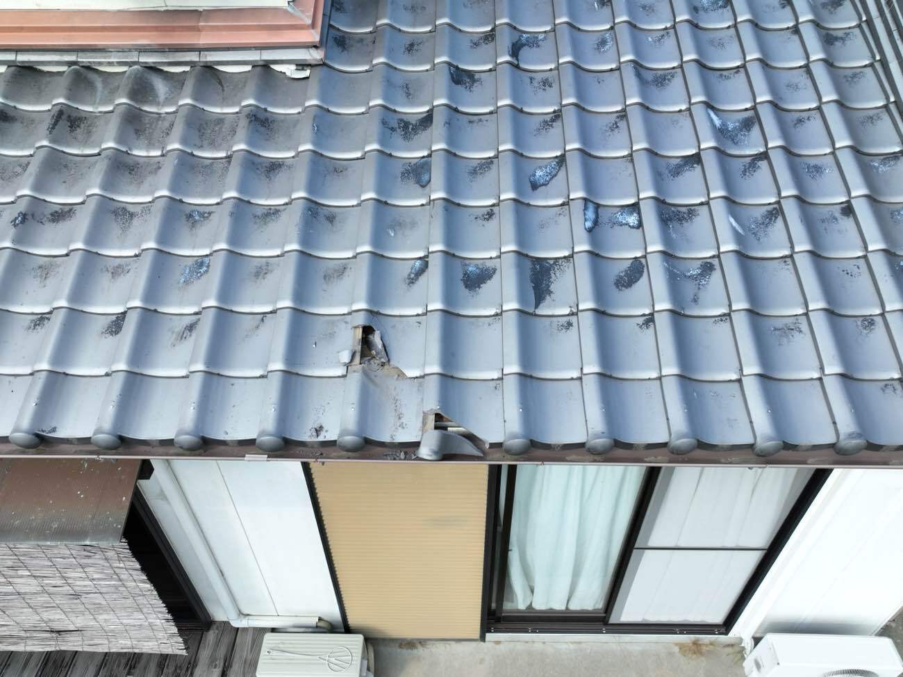 ②鬼瓦の落ちた先とみられる箇所の瓦が破損していました。
