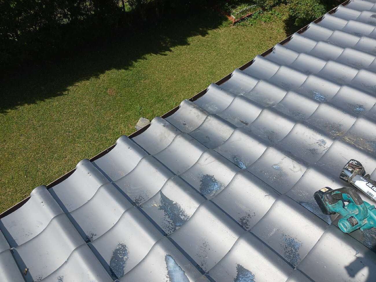 ⑥割れていた瓦を差し替えて、軒先瓦をビスで固定しました。