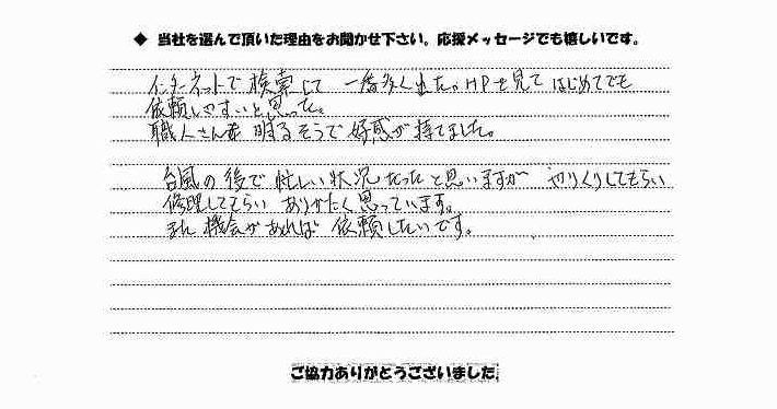 この度は実家の雨漏りを直していただき、ありがとうございました。 一度見ていただいてから数年たっての同じ場所の雨漏り。 正直本当に直してもらえるのかと思いました。 ですが、今回はじっくりとあらゆる方向からチ... 続きを読む